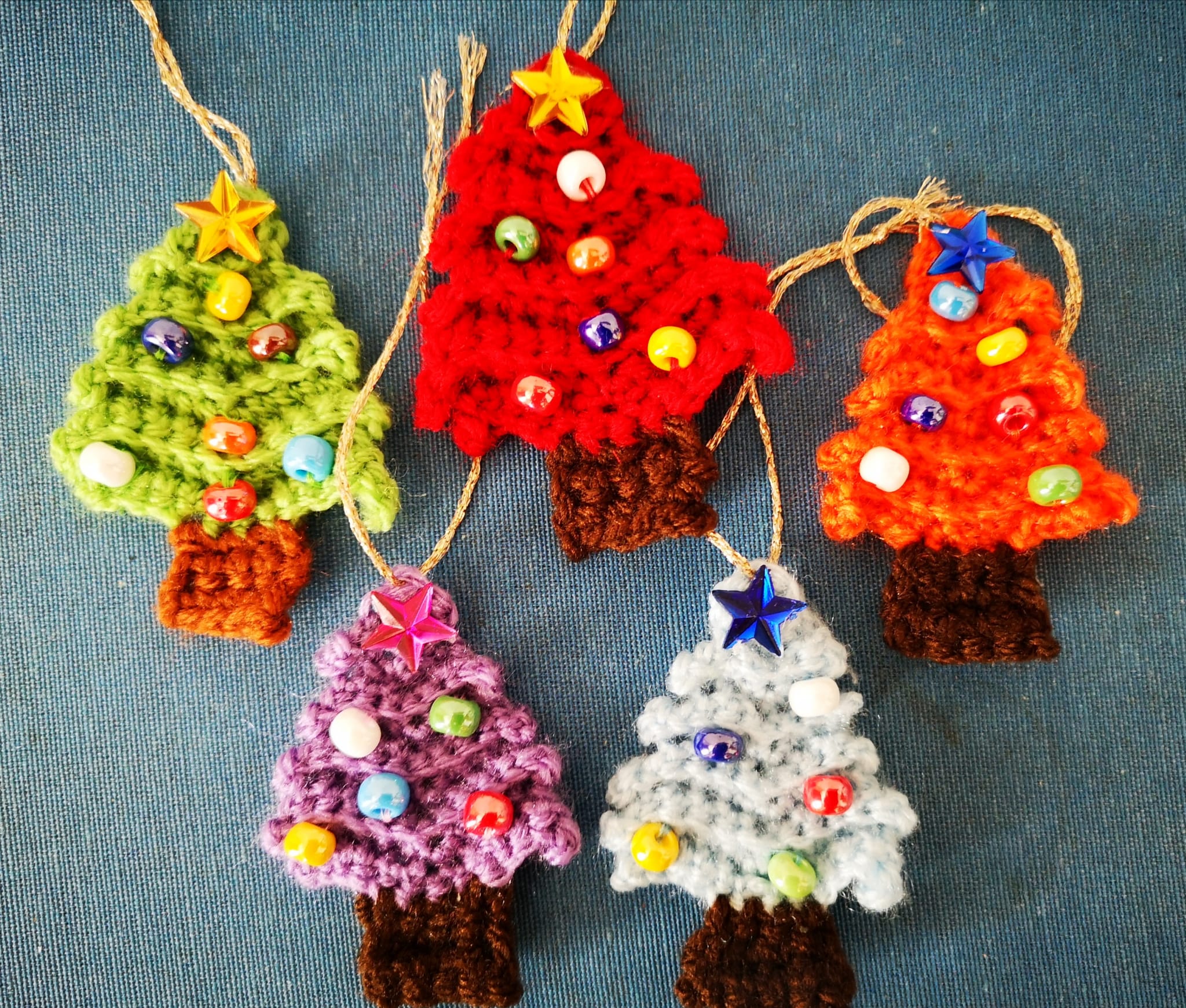 Alberelli di Natale addobbi in diversi colori. Materiale: lana acrilica, perline, filo d’oro. Dimensione: 7 cm. circa