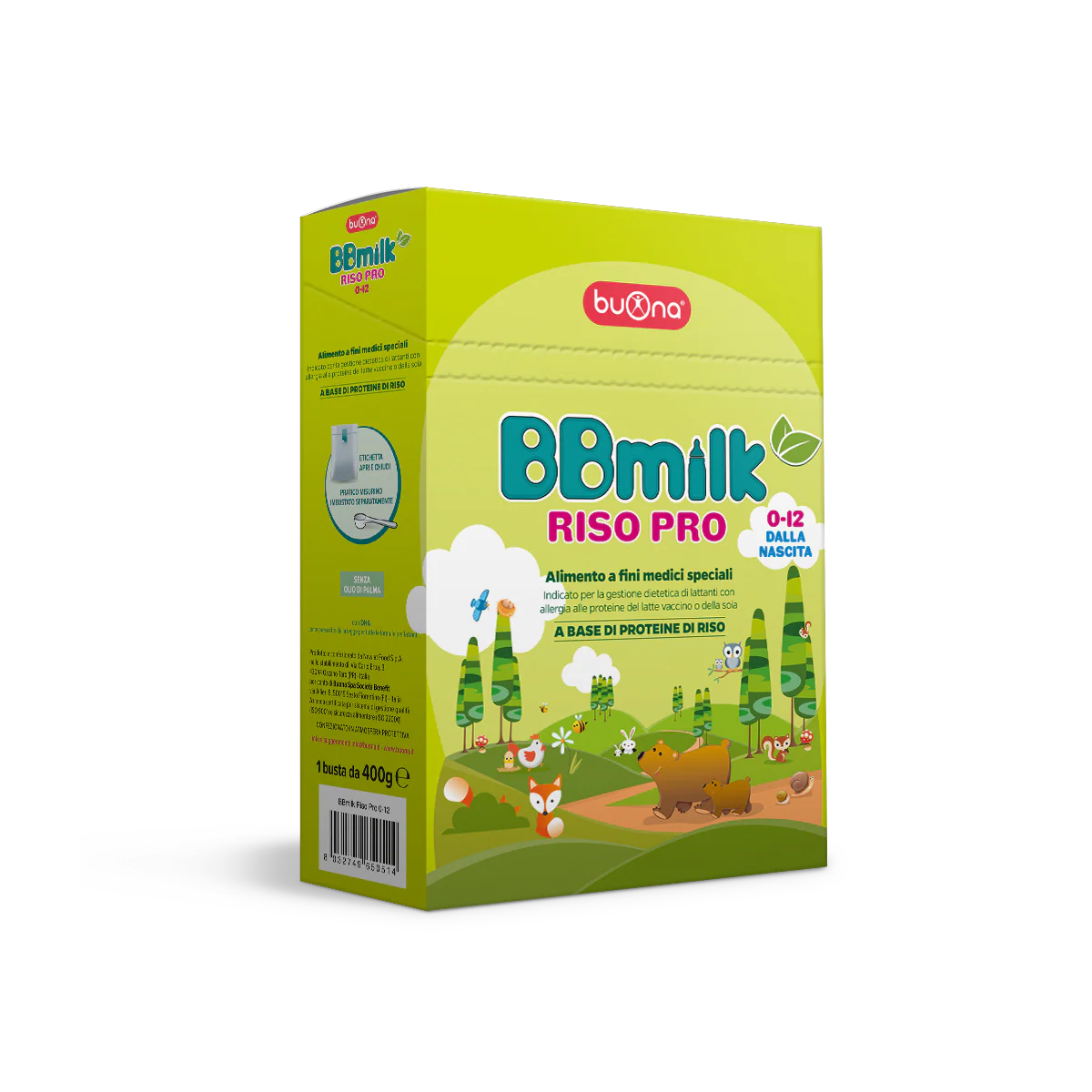 BBmilk RISO PRO 0-12 è un alimento a fini medici speciali, indicato per la gestione dietetica dell’allergia alle proteine del latte vaccino o della soia. BBmilk RISO PRO 0-12 è adatto all’alimentazione del lattante dalla nascita fino al 12° mese di vita.
