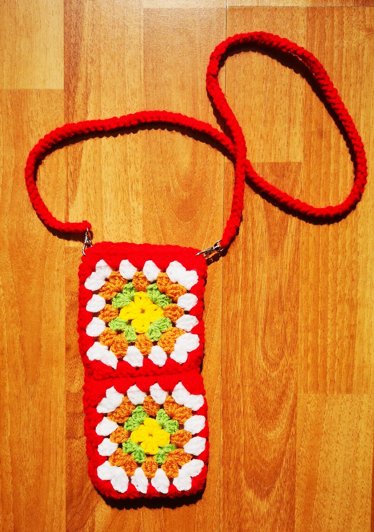 Borsetta a tracolla granny 1. lavorata interamente all’uncinetto (possibile averla in diversi colori). Materiale: filato acrilico, 2 moschettoni piccoli Dimensioni: 10×20 cm.