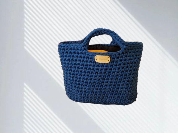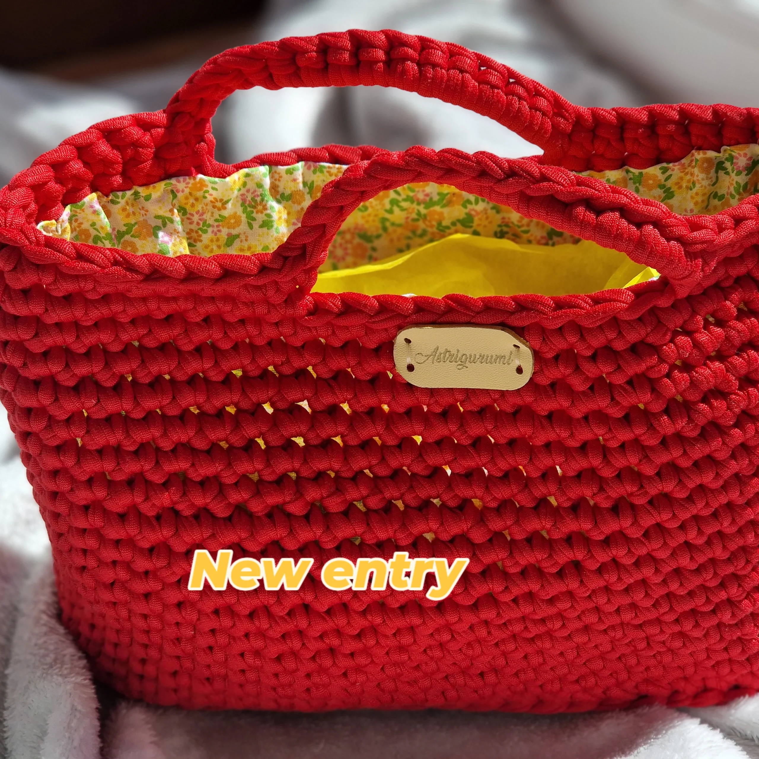 Pochette realizzata interamente all’uncinetto. Materiale: fetuccina in poliestere, con federa in rivestimento interno. Dimensione: con manici 22 cm altezza x 23 larghezza ca.
