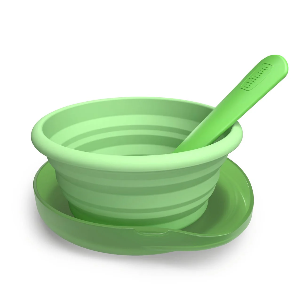 - IDEALE da portare sempre con te. Composto da un piatto in silicone pieghevole, un cucchiaio portatile e un astuccio di plastica.