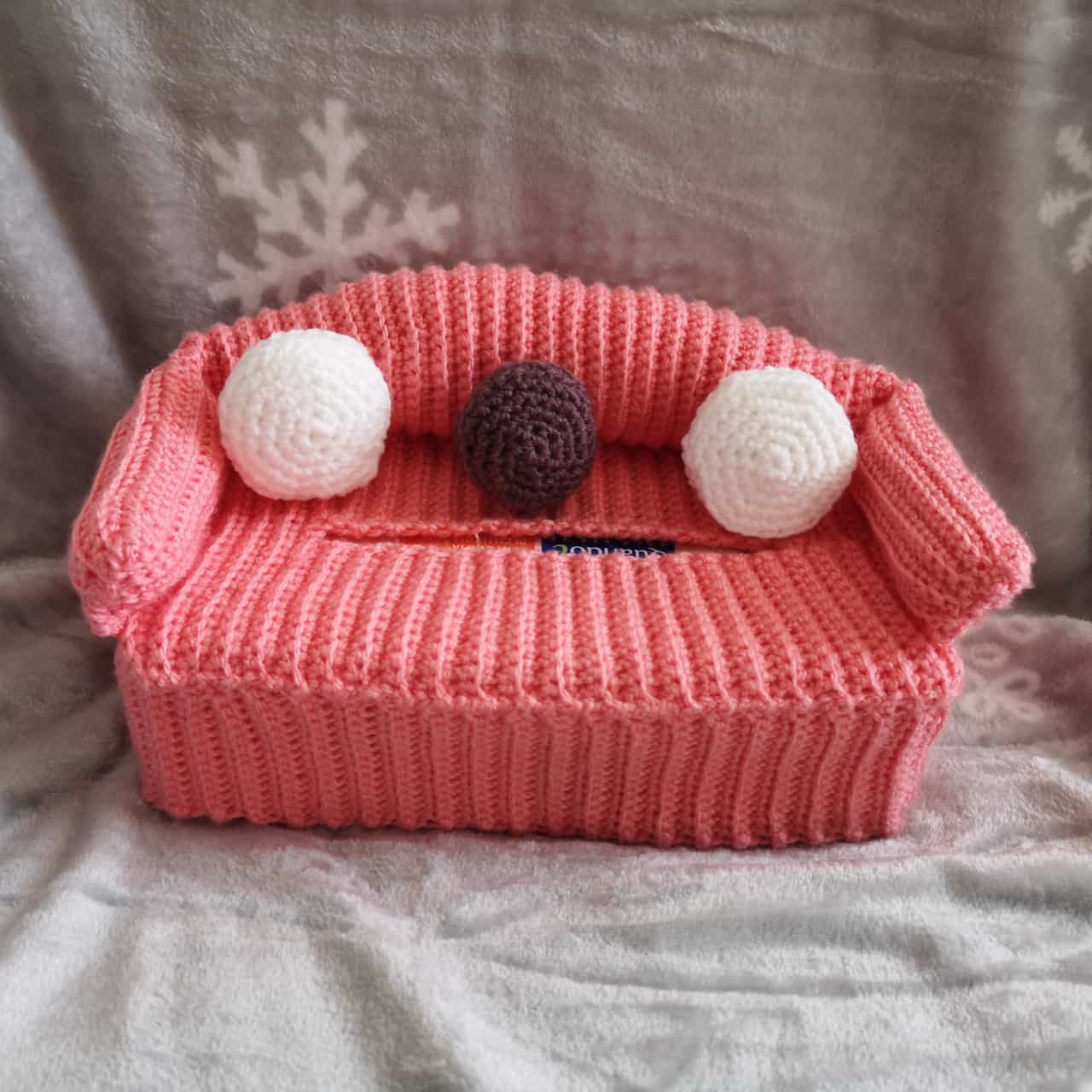 Cover divanetto per scatola kleenex (compresa nel prezzo). Lavorato all’uncinetto interamente a mano. Possibilità di avere in diversi colori. Materiale: ovatta per imbottitura, scatola kleenex Dimensione: 15 cm. x 28 cm. divanetto con scatola kleenex