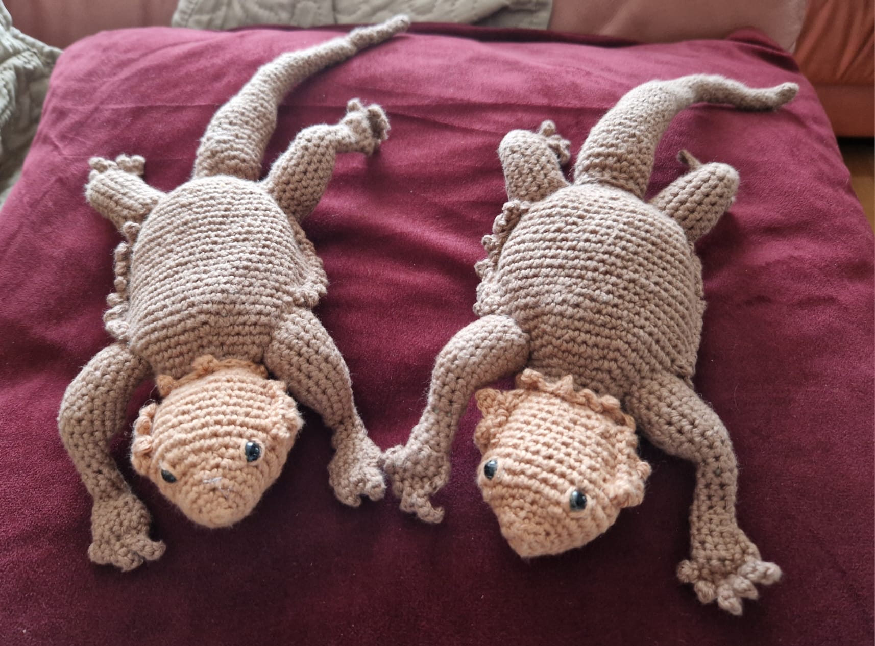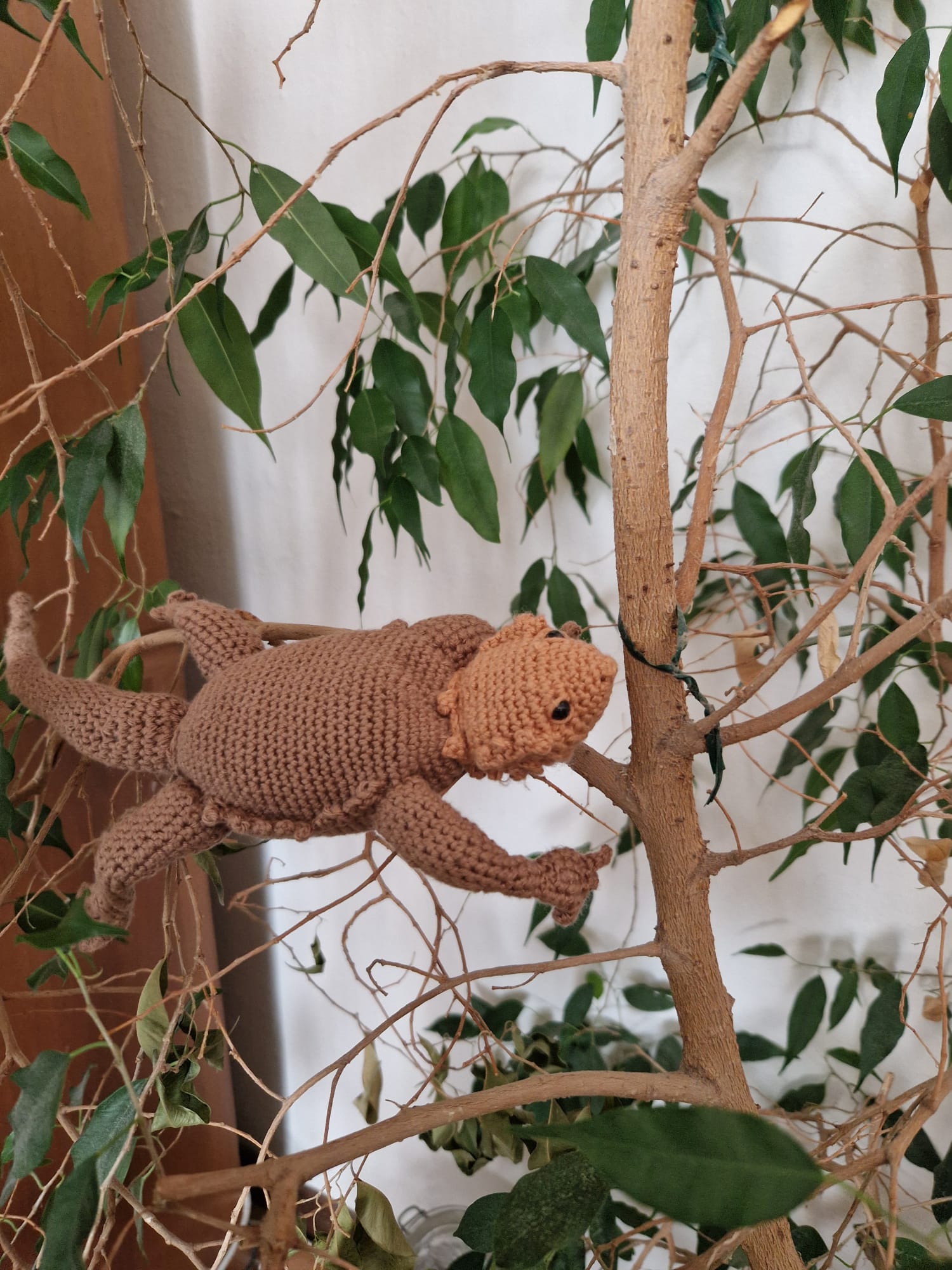 Drago barbuto lavorato a mano all’uncinetto. Materiale: cotone 100%, filo di ferro, ovatta per imbottitura, occhi di plastica con sicurezza. Dimensioni: 32 cm ca.