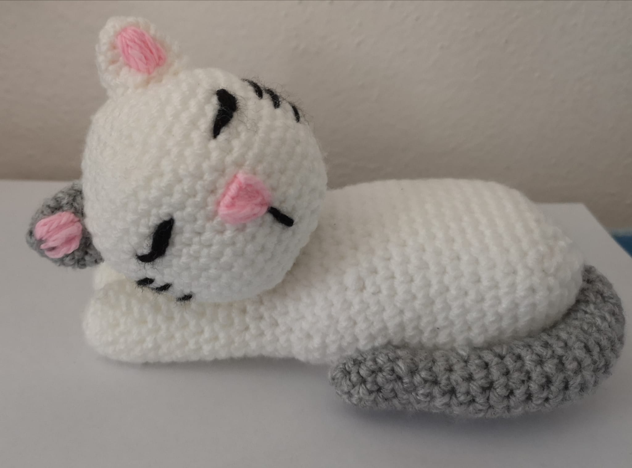 Gattino che dorme lavorato interamente a mano all’uncinetto. Materiale: lana acrilica Dimensioni: 16 cm