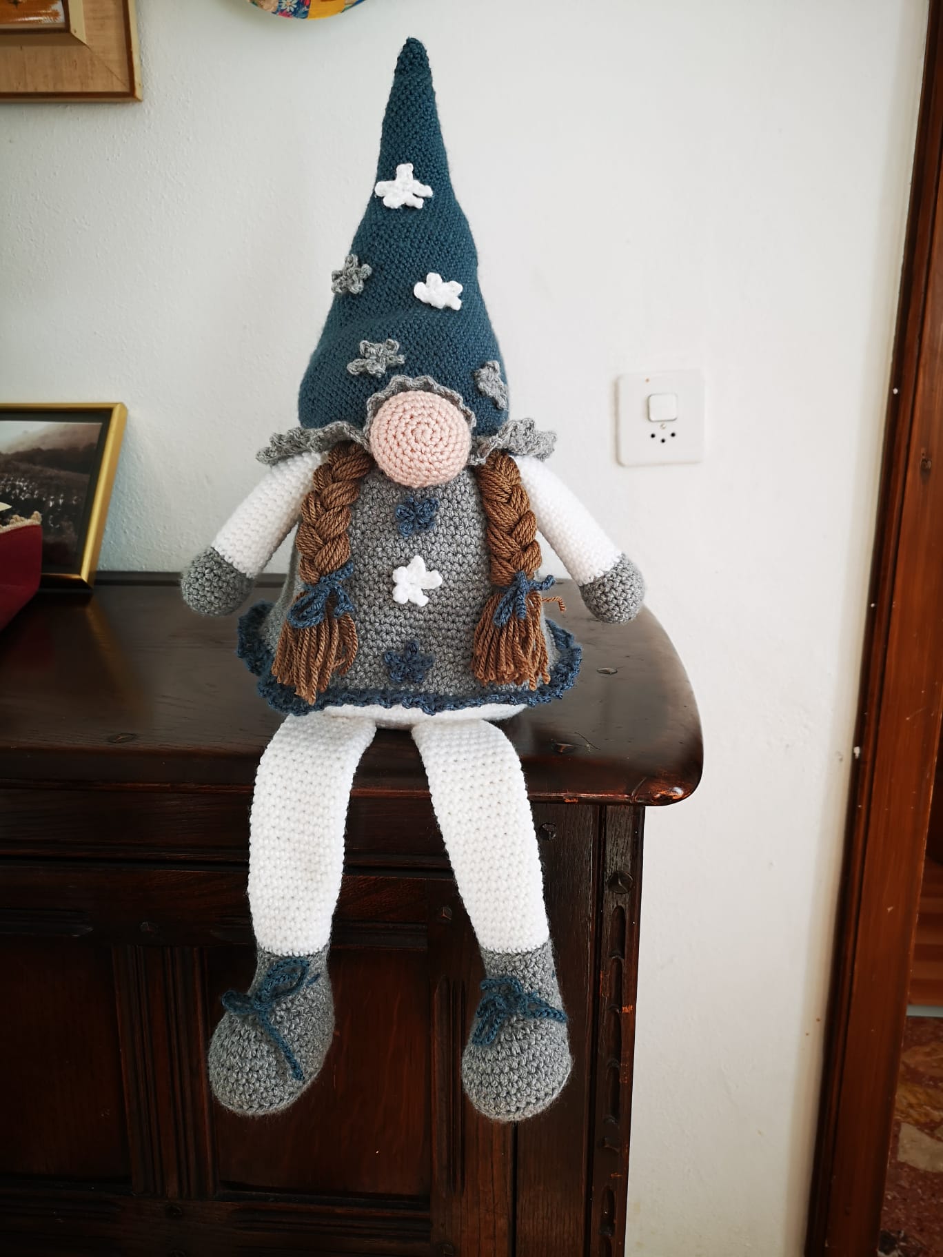 Gnoma di natale creata interamente a mano all’uncinetto. E’ possibile averla anche in diversi colori. Materiale: lana acrilica, ovatta per imbottitura. Dimensione: In piedi 60 cm. ca., seduta 30 cm. circa