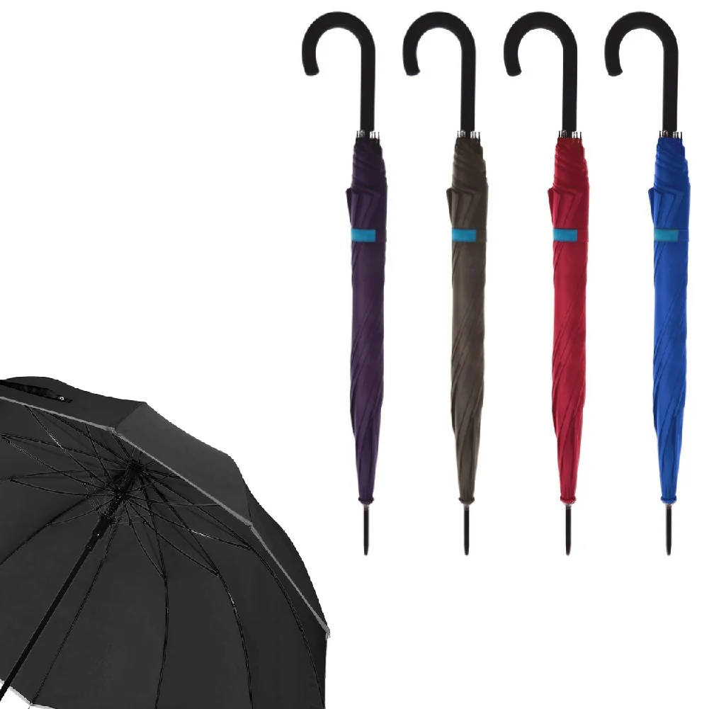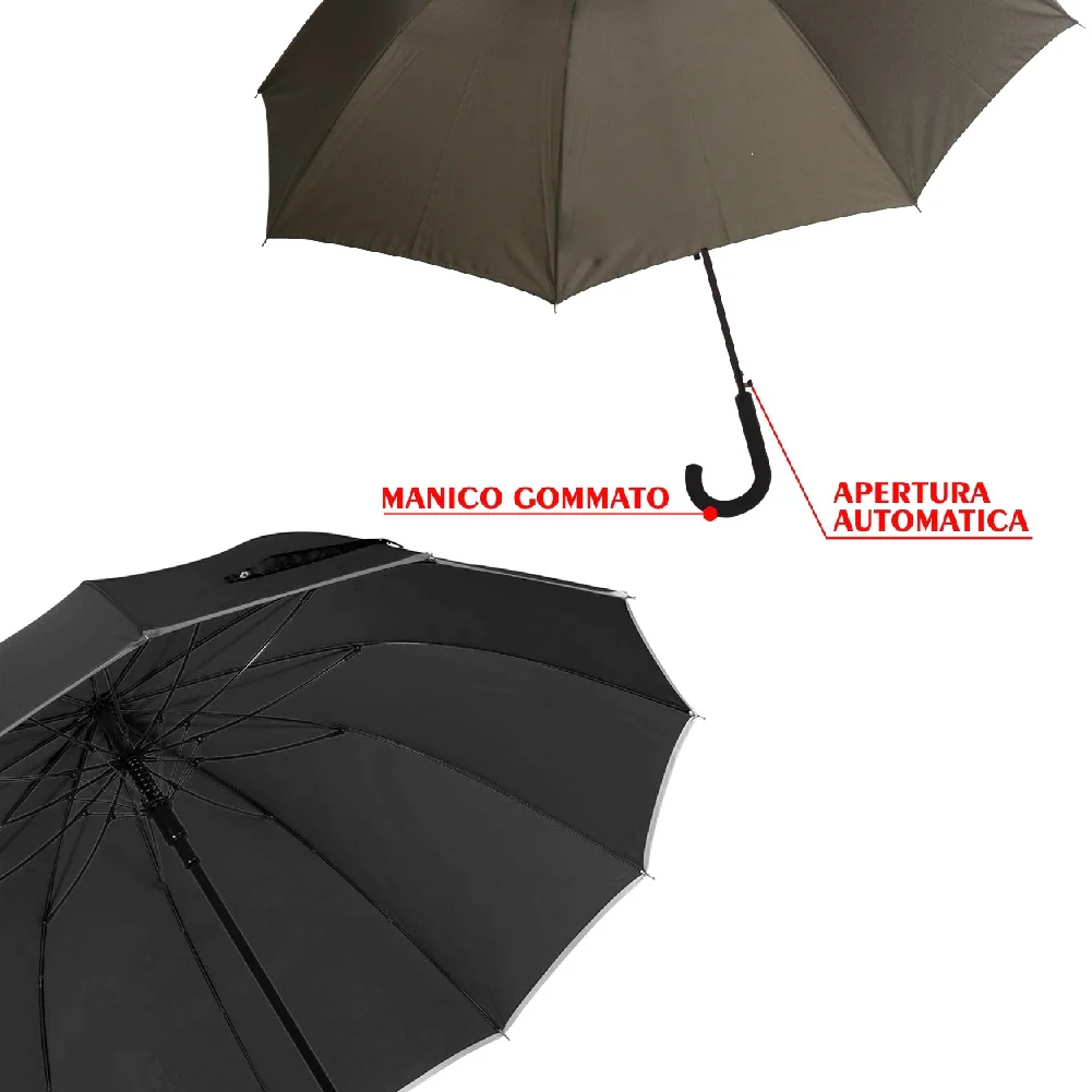 - La resistenza al vento, le 12 stecche in fibra di vetro ed il manico gommato, evitano che l’ombrello si rovesci o si danneggi in presenza di forti venti.