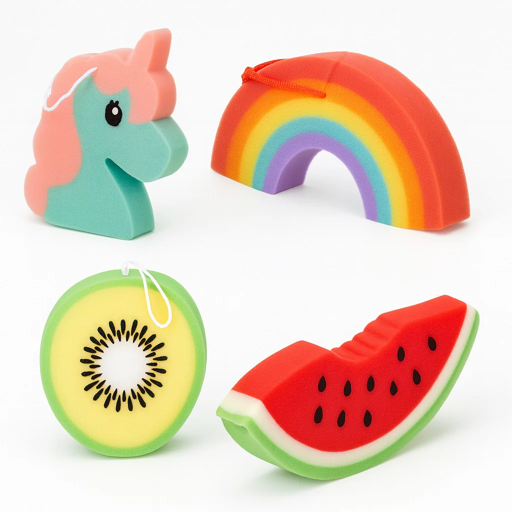 kit 4 Spugne Bagno Corpo Colorate Forme Miste Frutta Unicorno Arcobaleno Bambini Adulti