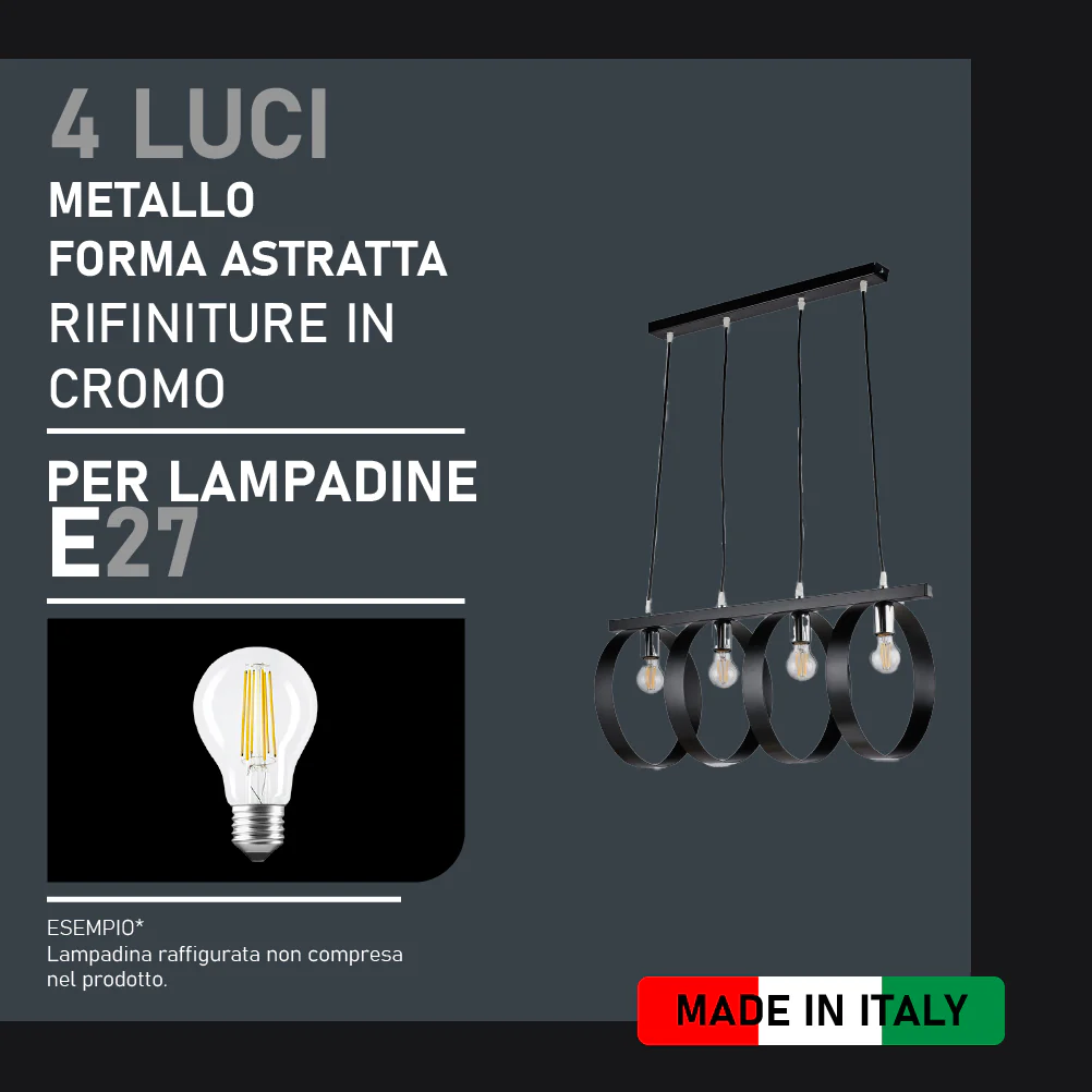 Lampadario Sospensione Metallo verniciato Barbara 4 Luci E27 Nero/Cromo