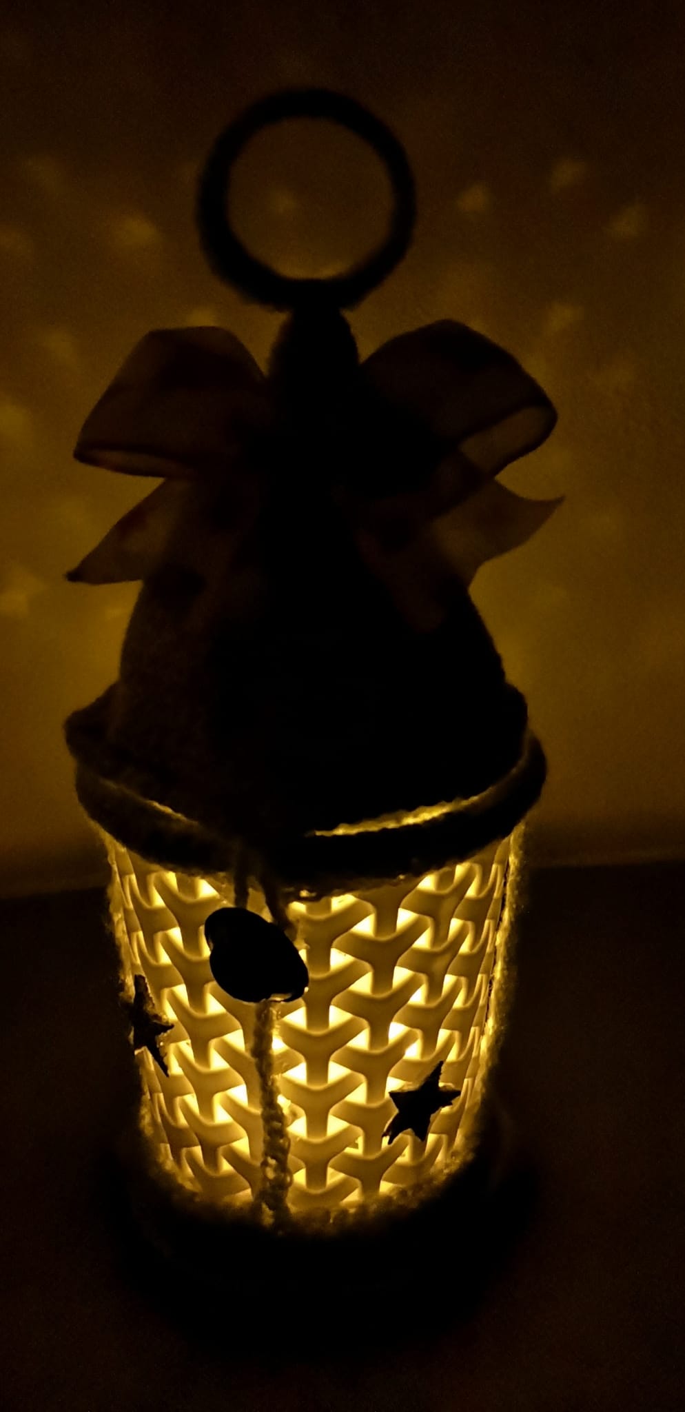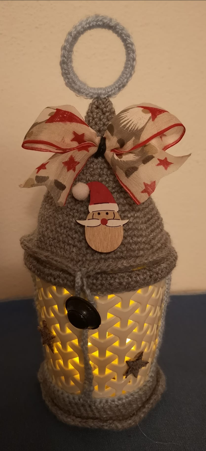 Lanterna creata all’uncinetto a mano. Con decorazioni natalizie.