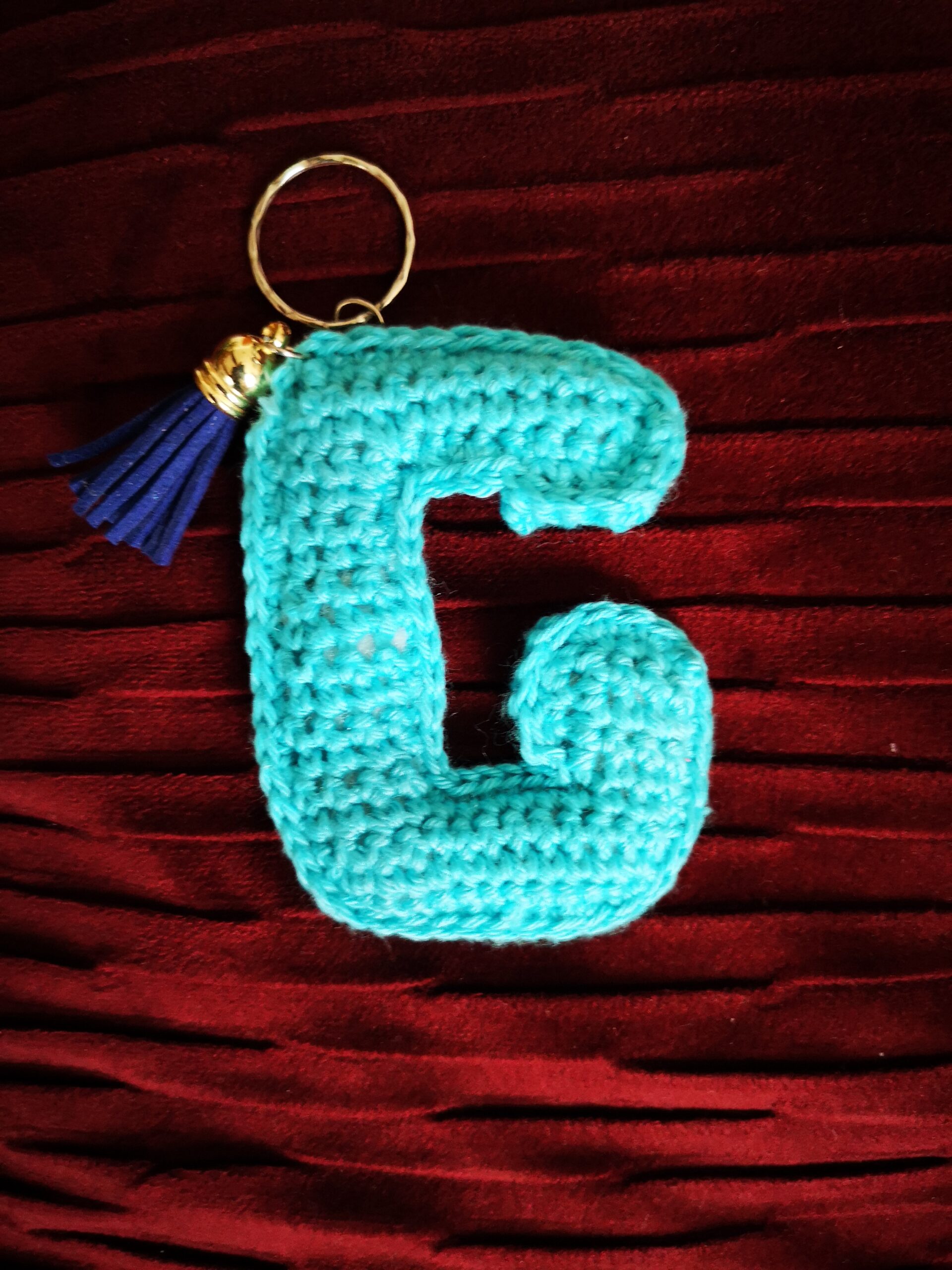 Lettera ‘G’ portachiavi. Lavorata interamente all’uncinetto.