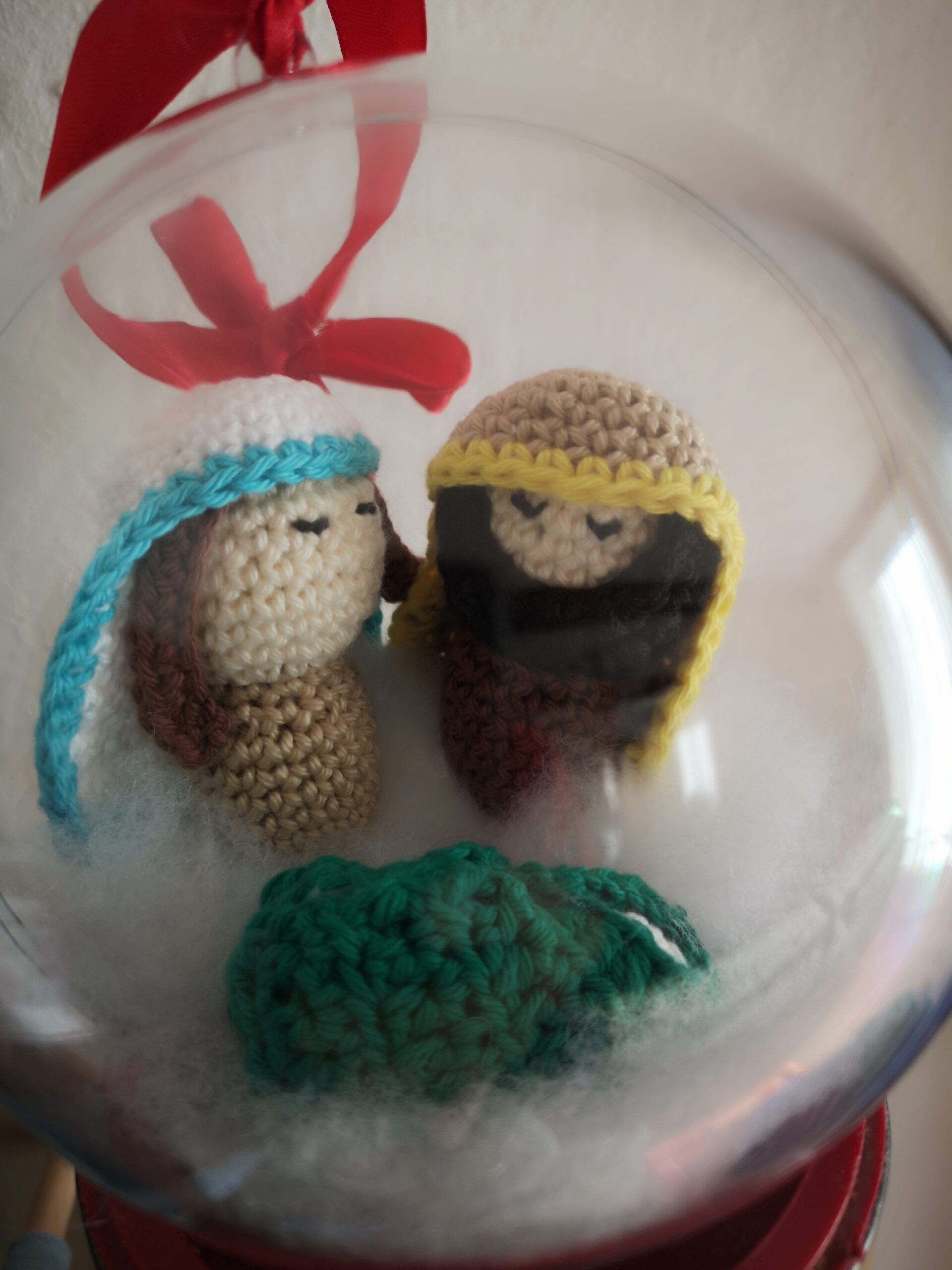 Mini presepe in boccia di 12 cm, amigurumi lavorato a mano all’uncinetto.