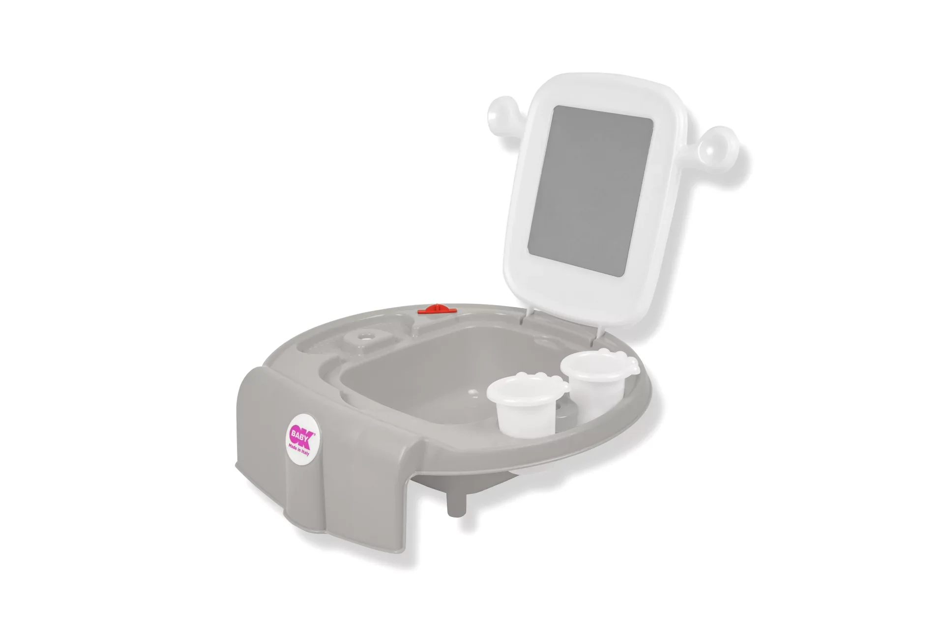 Dotato di specchio infrangibile;Il sistema di regolazione permette di poter fissare il mini-lavandino sia alla maggior parte delle vasche da bagno per adulti che ai bidet;Dotato di tappo per un facile svuotamento dell’acqua.Misure di ingombro massimo: b cm 39 x h 13 x p 40