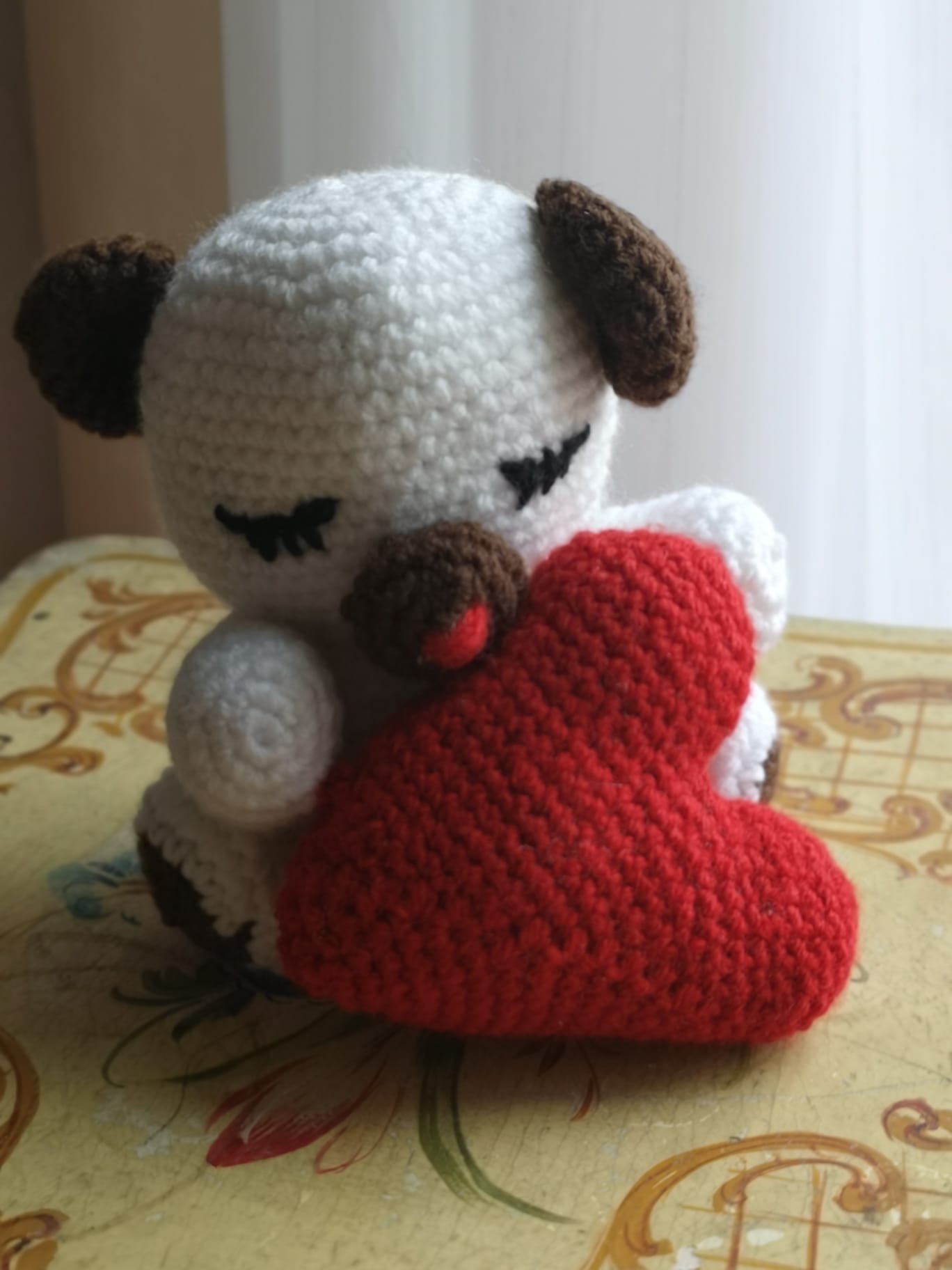 Orsetta innamorata con cuore, realizzata all’uncinetto fatta interamente a mano.