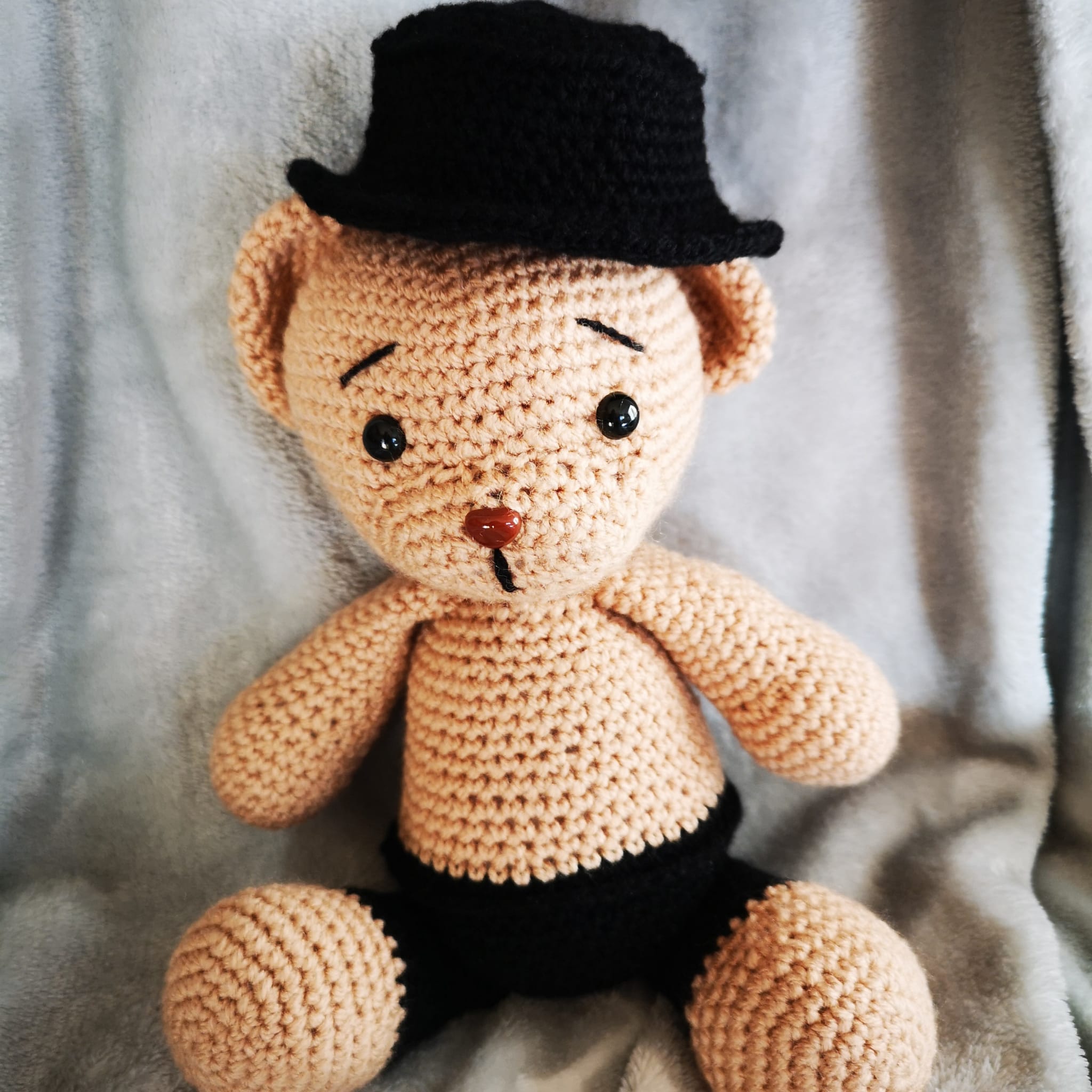 Orso con cilindro, lavorato interamente a mano all’uncinetto ‘Amigurumi’.
