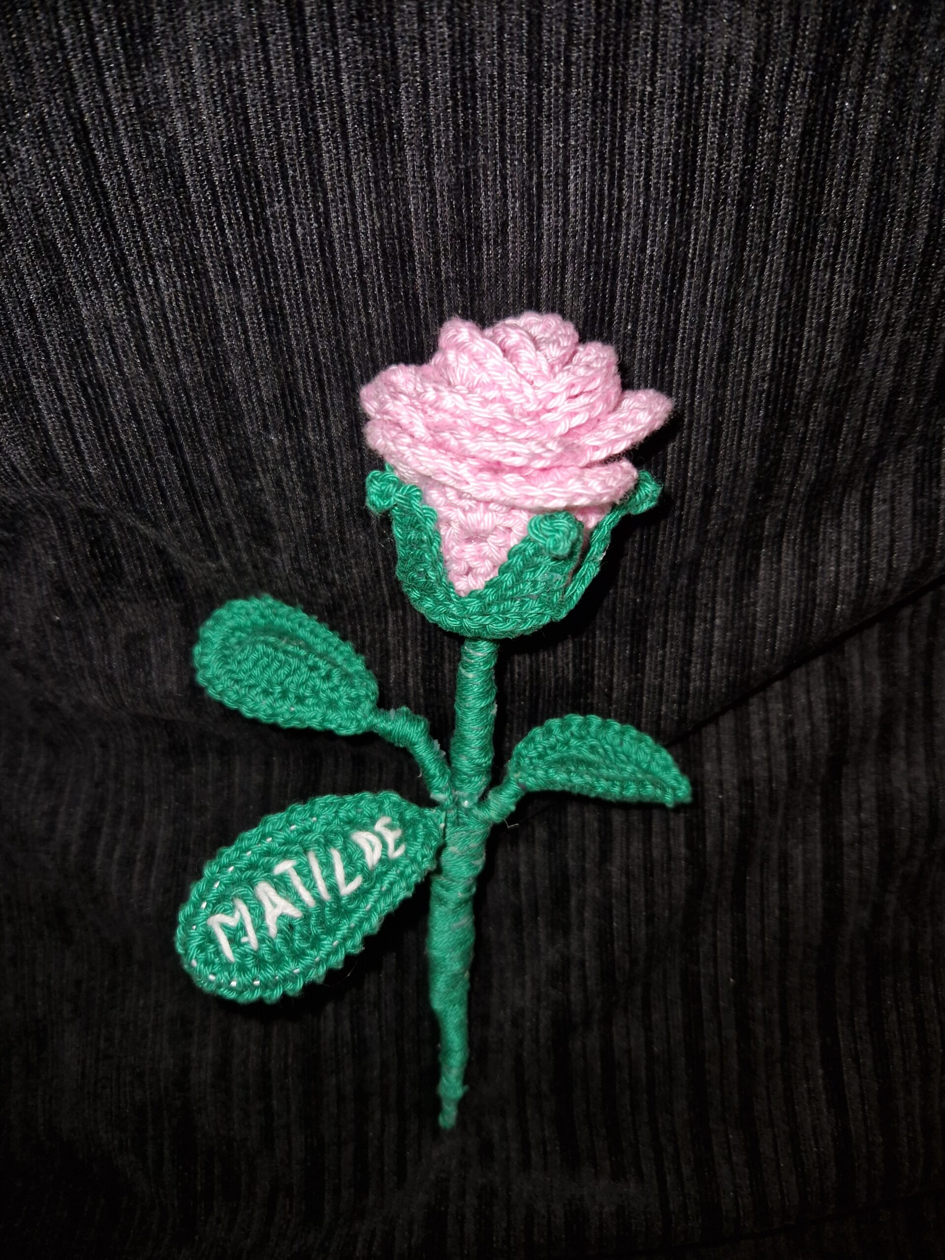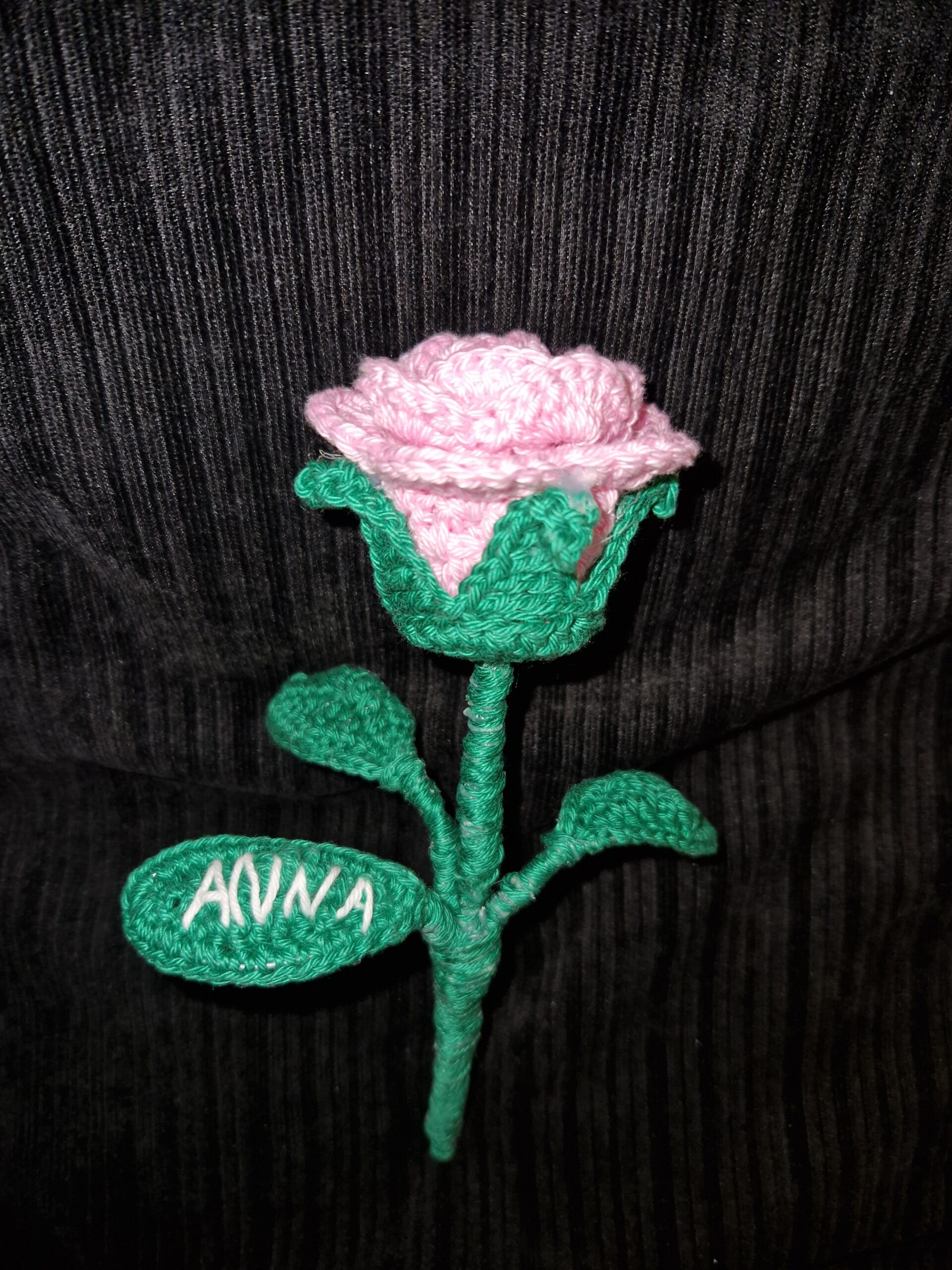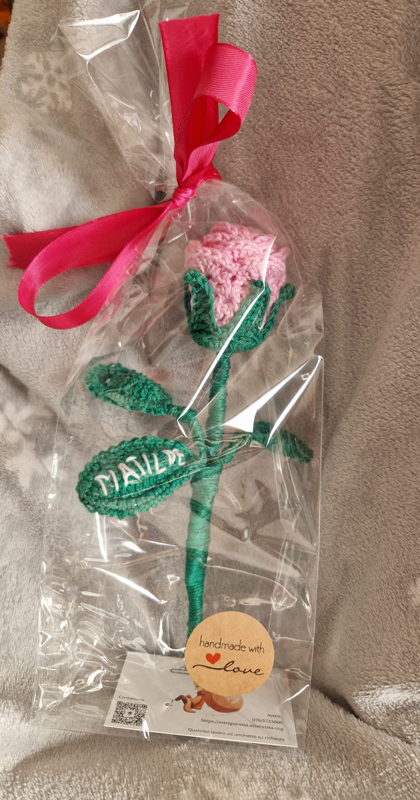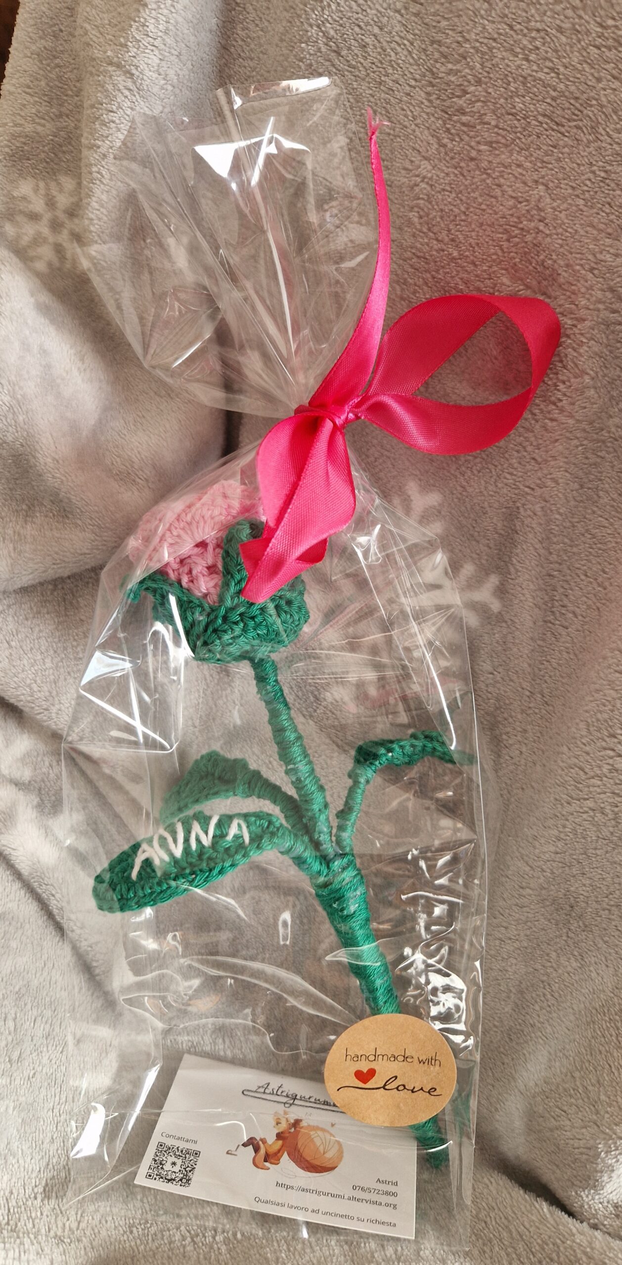 Rosa personalizzata in diversi colori e con possibilità di scrivere il nome della propria figlia/o, compagna, fidanzata,… Materiale: 100% cotone, filo di ferro. Dimensioni: 24 cm.ca.