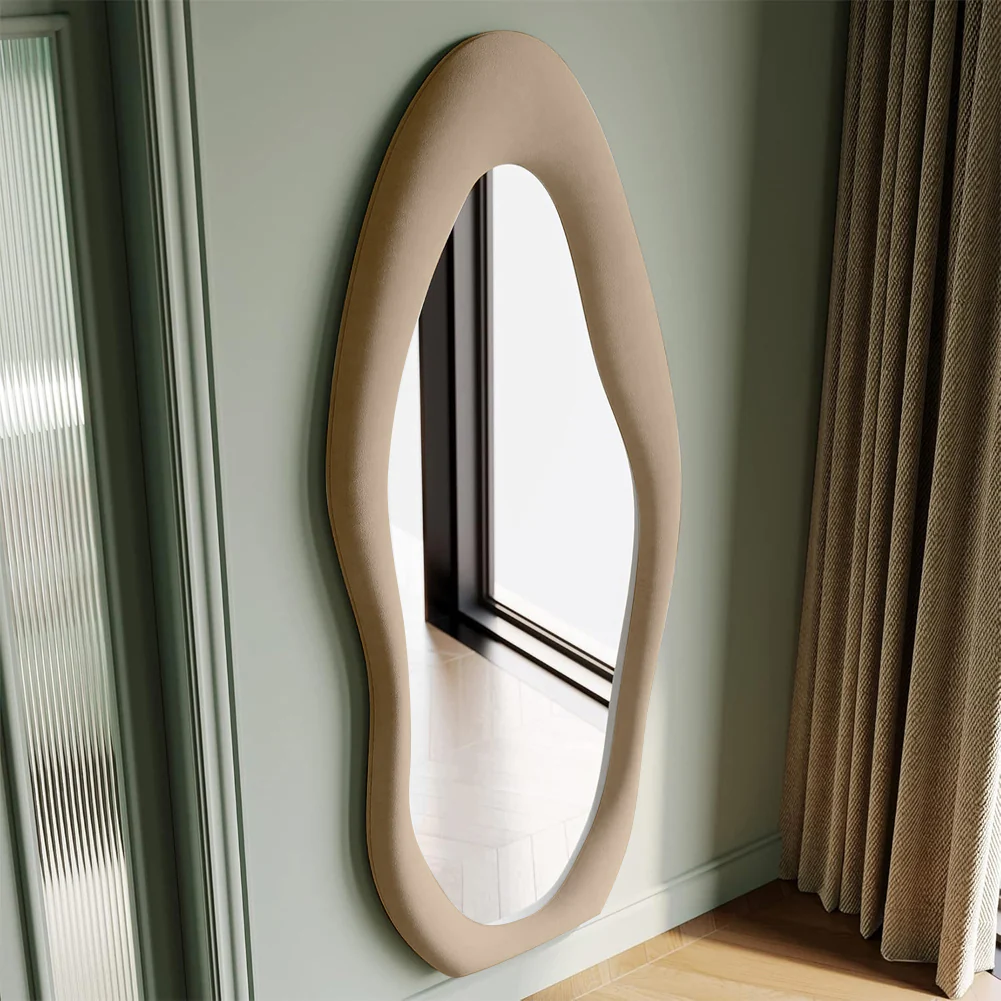 Specchio Grande Ondulato 60×160 cm da Parete con Cornice in Velluto Moderno Beige