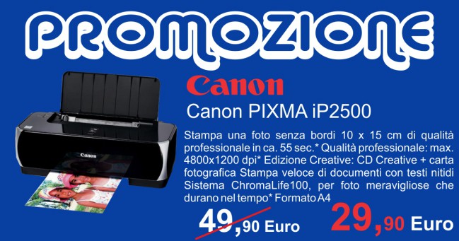 Canon PIXMA iP2500 Stampante per la casa elegante e di alta qualità per creare foto e documenti creativi in libertà Questa elegante stampante dal design esclusivo produce stampe di qualità professionale e testi nitidi a velocità elevate. La dotazione standard della stampante include il CD Creative e una confezione di carta fotografica per esprimere fin da subito la tua creatività . Benefici Stampa una foto senza bordi 10 x 15 cm di qualità professionale in ca. 55 sec.* Qualità professionale: max. 4800×1200 dpi* Edizione Creative: CD Creative + carta fotografica Stampa veloce di documenti con testi nitidi Sistema ChromaLife100, per foto meravigliose che durano nel tempo*