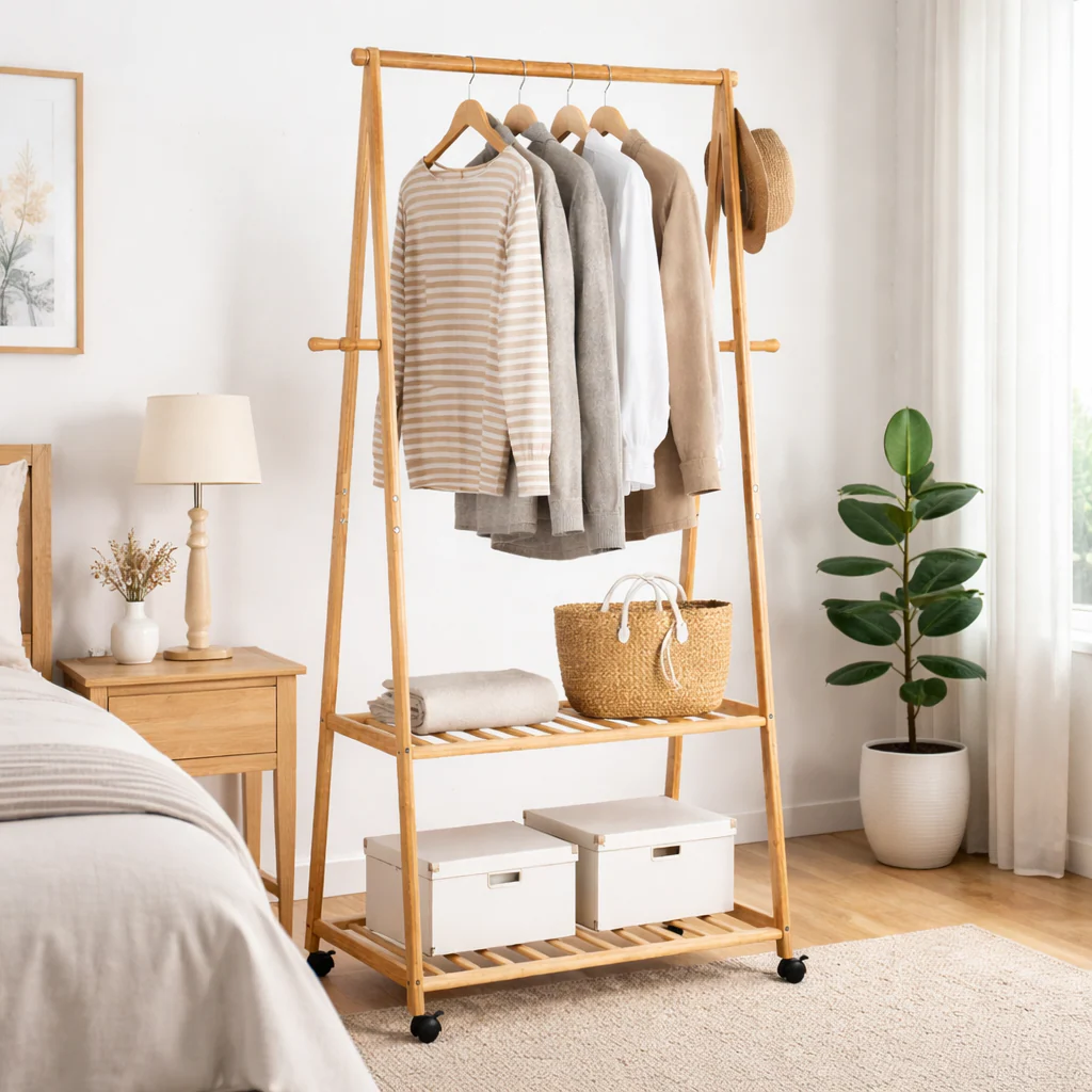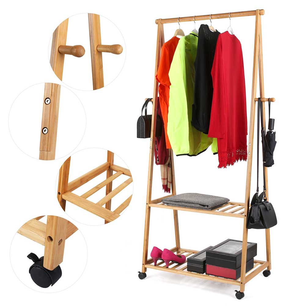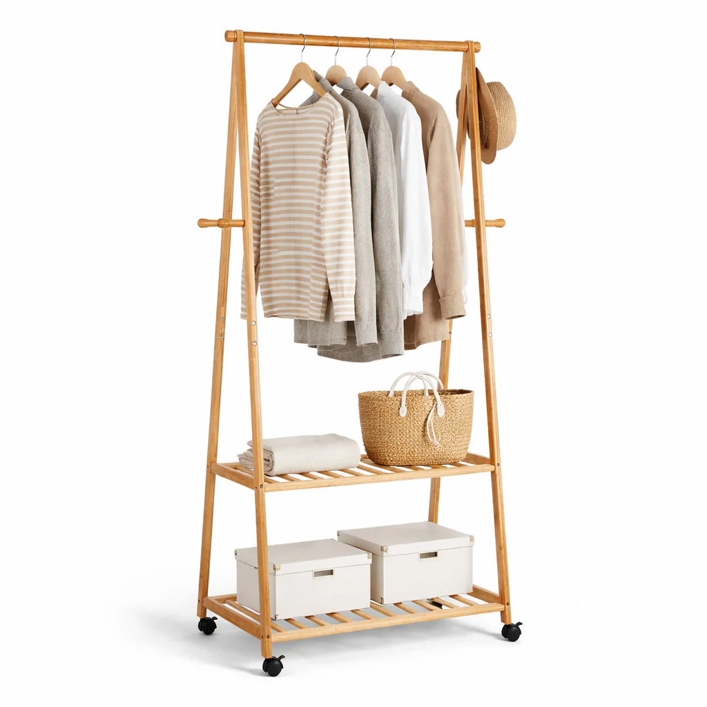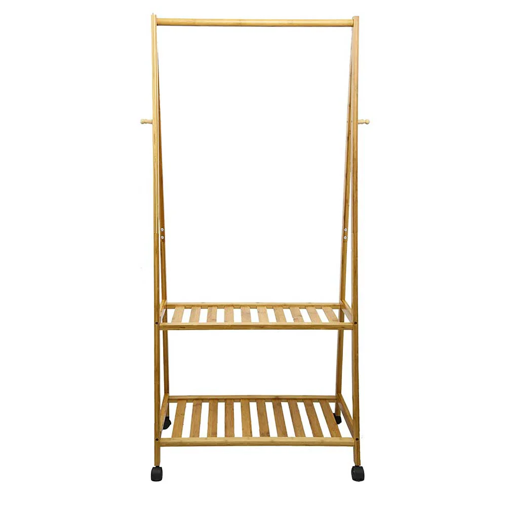 Stand Appendiabiti in Legno di Bambù con Ruote 2 Ripiani per Camera e Ingresso