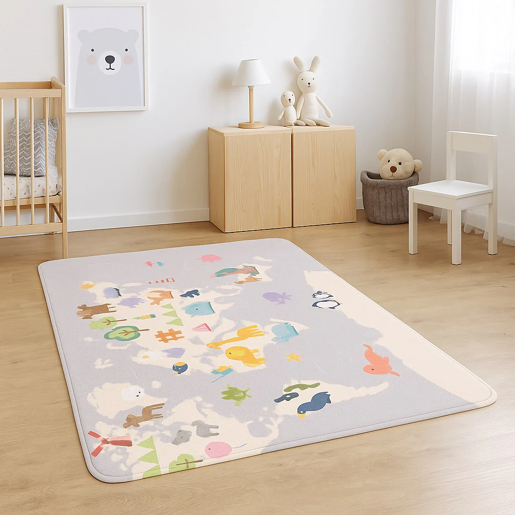 Tappeto Cameretta Bambini 80×140 Grigio Morbido Mondo Animali in Polyestere e Spugna