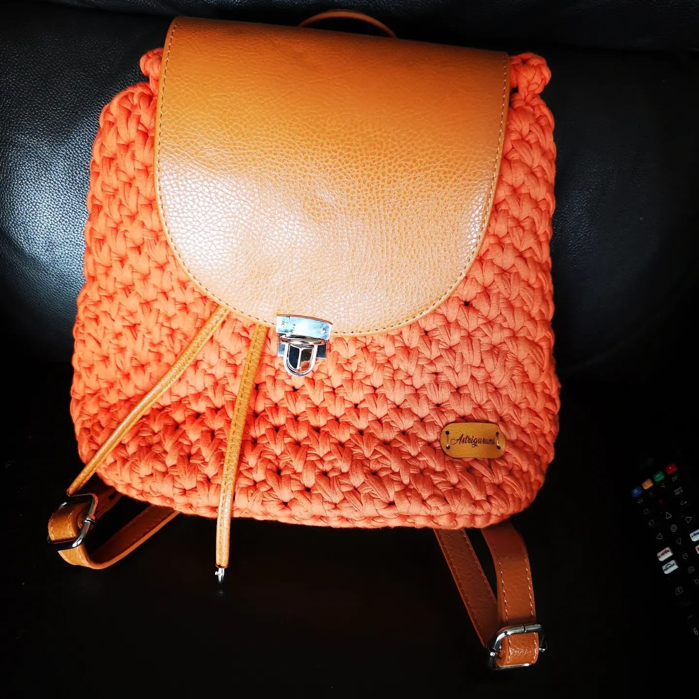 Zainetto realizzato all’uncinetto . Su comanda è possibile averlo in diversi colori. Materiale: Filato fettuccia in cotone, diverse parti in vero cuoio. Dimensioni: altezza 27/28 cm. circa